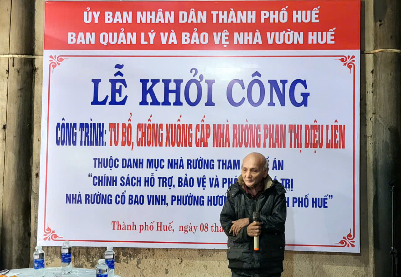 Phó Trưởng Ban Quản lý và bảo vệ nhà vườn Huế phát biểu tại buổi khởi công.